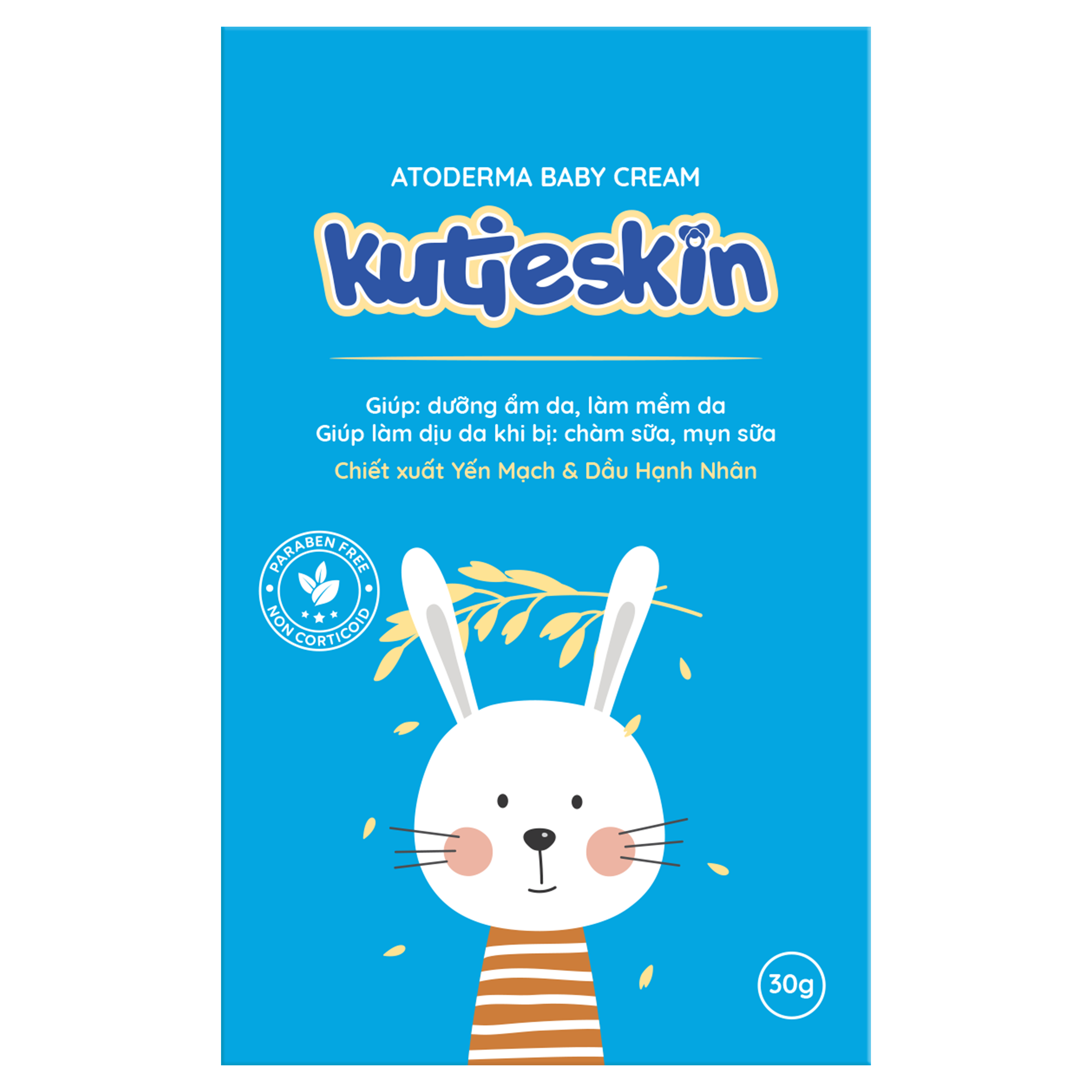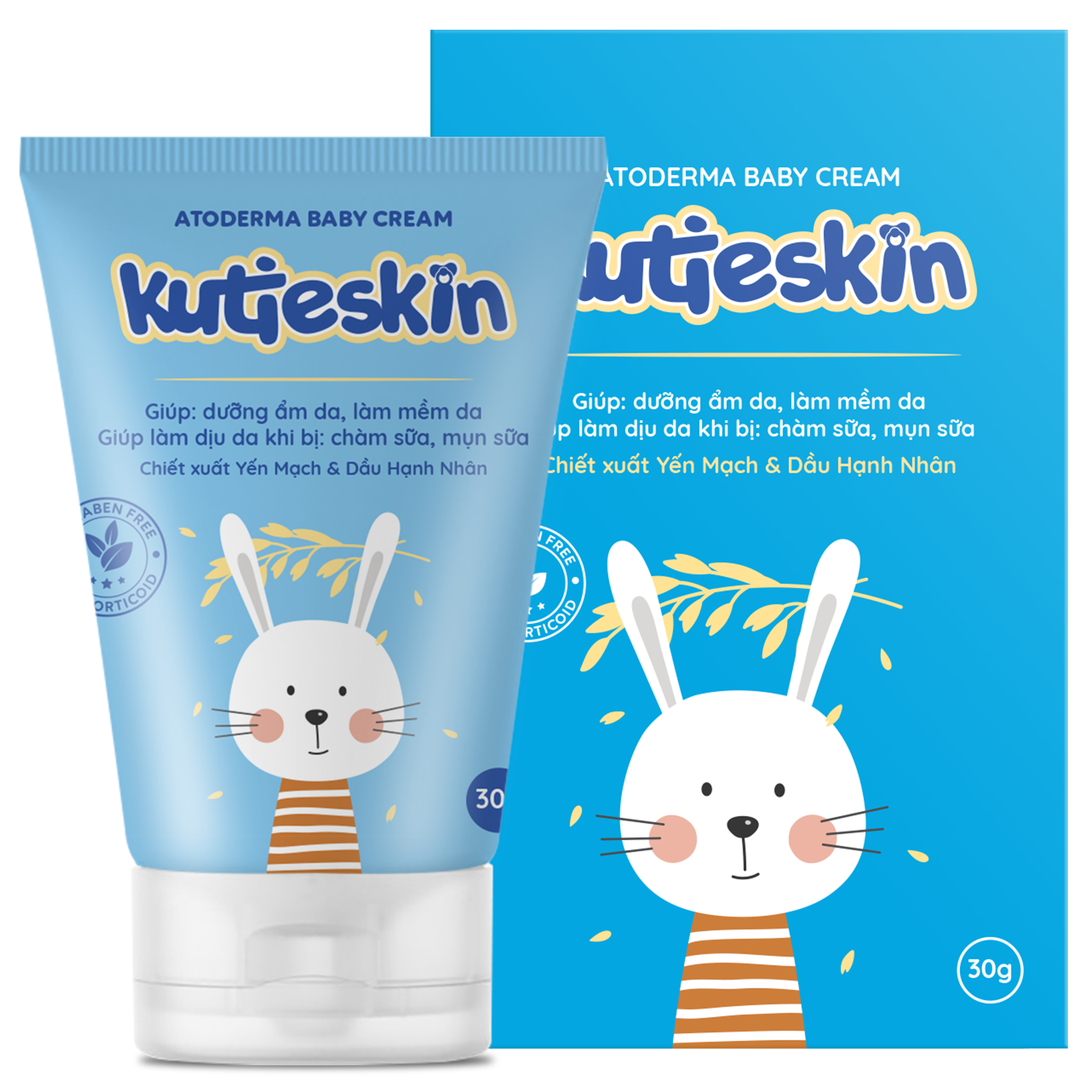 - Kem chàm sữa Kutieskin với thành phần chiết xuất yến mạch, rau má, bơ shea và Ceramide giúp góp phần cải thiện tình trạng bong tróc, ngứa ngáy, khó chịu khi bị chàm sữa (lác sữa), viêm da.